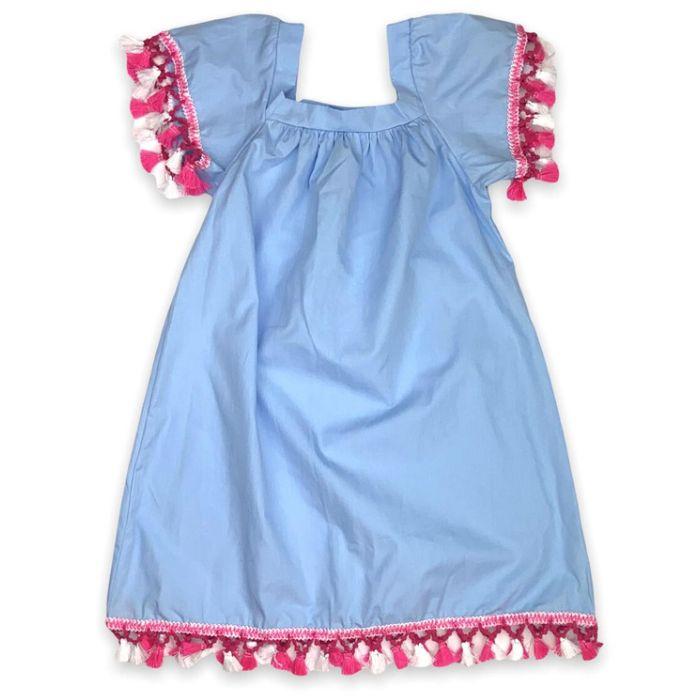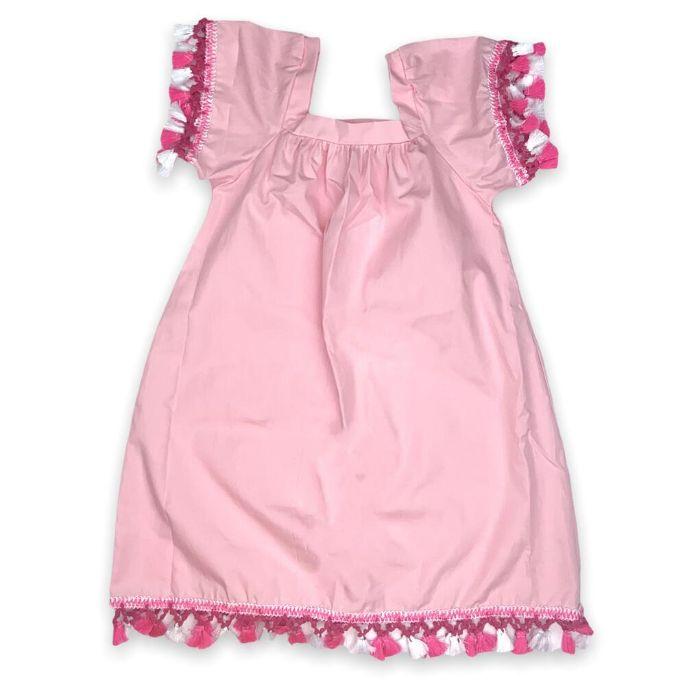 100% cotton dress featuring white and pink fringes on the sleeves and hem.