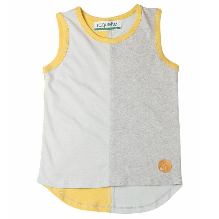a sporty summer top with curved hemline and bold assymetric color blocking, softly binded neckline...