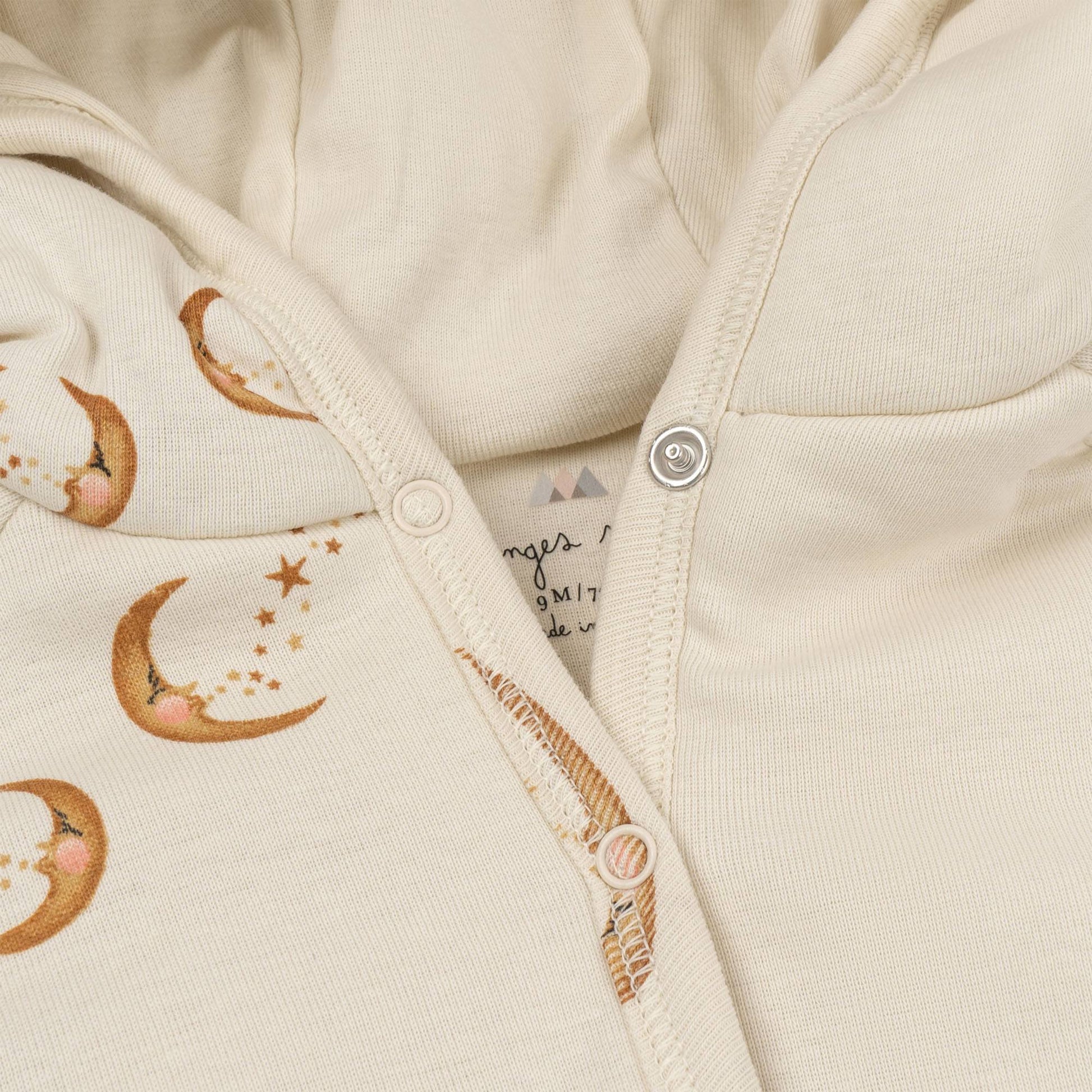Soft and snug onesie made in 100 percent organic cotton rib made to fit the littlest one. The elasticated hood keeps ears warm and snap buttons in front make it easy to tuck in the baby.