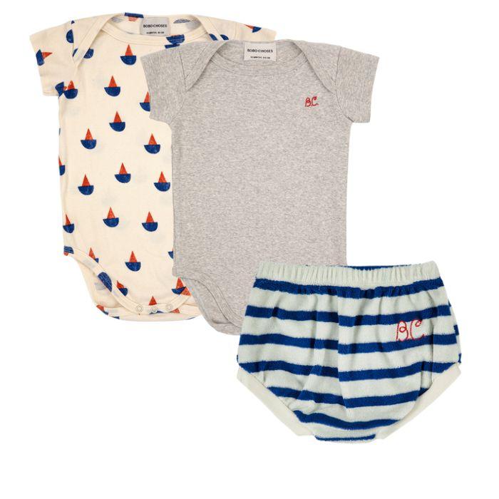 94% organic cotton 6% elastane grey and boats short sleeve bodies, designed with short sleeves, crotch snap fastening, embroidery and envelope neck.