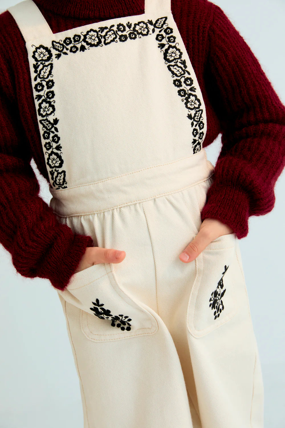 A stylish denim overall featuring contrast embroidery details on the upper front and two functional patch pockets. Designed with an elasticized back waistband and adjustable shoulder straps for a comfortable, customizable fit. Perfect for layering or wearing on its own for a playful, versatile look.